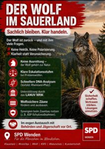 Der Wolf ist ein geschütztes Wildtier und Teil des natürlichen Ökosystems. Eine erneute Ausrottung kommt daher nicht in Betracht. Gleichzeitig müssen die Sorgen von Weidetierhaltenden und der Bevölkerung sehr ernst genommen werden. Aus Sicht der SPD braucht es klare und praktikable Lösungen. Dazu gehört ein abgestuftes Vorgehen bei auffälligen Tieren. Die Fraktion spricht sich für transparente Eskalationsstufen aus, die Sicherheit schaffen und Handlungsmöglichkeiten definieren.
